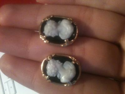 My grandma passed away and we went to collect things from her estate. We found these... can you tell me anything about them? They appear to be cameo clip on earrings ("ear screws") possibly in onyx with a lady on them. There is a marking on the gold border that says 14k. Any ideas?