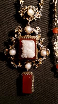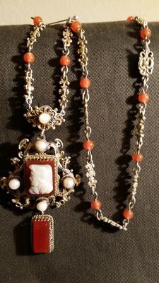 I have had this cameo necklace for over 20 years. I purchased it from a church sale from an estate. It has been sitting in my jewelry box. Would love to know what the stamps indicate? History of any kind would be appreciated.