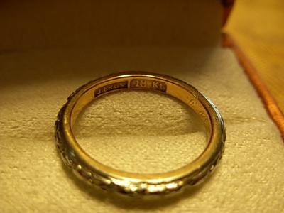 This ring was purchased at an estate jewelry store. I have not been able to find anything like this on the internet. The ring is two tone 18k gold marked on the inside with J BROS and 18bKt. The engraving says 4-12-16?