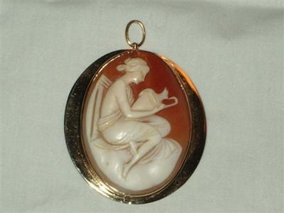 This cameo pendant/broach was my grandmother's. I believe she brought it from England in the 1930's, and I think it's quite old - seems to me to be an art deco design, and I wonder where it was made. Note there's a signature on the back. I had it framed in 14 caret gold about 40 years ago. Please tell me what you might know about it and a general idea of its worth. Thank you.