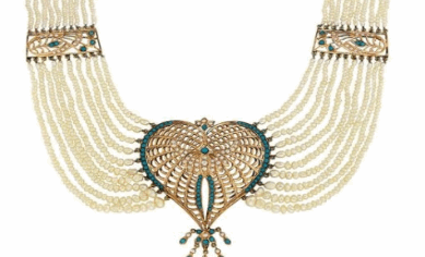 The highlight of the Jewelry of Umm Khalthum was an emerald, diamond, and pearl set comprising a brooch, a bracelet and a pair of earrings that are estimated to be worth $40,000 to $60,000.