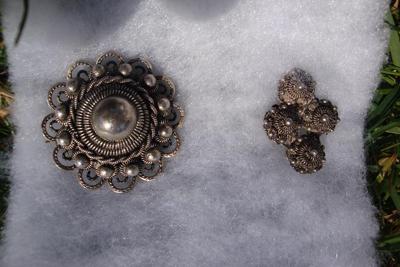 My grandmother passed away a few months ago and left behind some older jewelry. Unfortunately, nobody in the family knows anything about the pieces. Among them is what looks like a matching set of large and small brooches/pins and a ring. They appear to be made of silver and it looks like the large brooch and the ring are marked with the numbers 825.