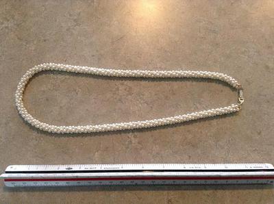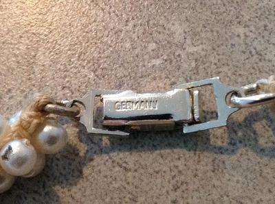 Multi strand of pearls with cotton string. Clasp is marked 'Germany'- the only mark on the clasp. The size of the pearls looks identical. Is it possible that given the size/shape of the pearls and no mark that they could be real? Also, do you think these are pre WWII or after 1990. They are so small and close together, it is hard to do the 'tooth test'. Also, what is this style of 'twisted' beading called?