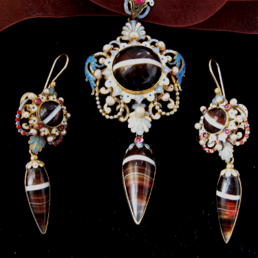 Renaissance Revival Striped Agate Gemstone and Enamel Demi Parure