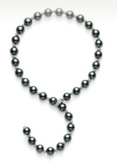 This beautiful Mikimoto Black Pearl Lariat Necklace (below) of 11mm Black South Sea Culture Pearls with pavè diamond rondelles with pavè diamond clasp in 18k white gold retails for $60,000.00