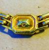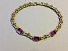 There are 3 Fuscia colored emerald cut crystals on a gold interlocking choker style necklace. The center crystal has the Swarovski swan logo embossed. I'm curious as to the age and value.