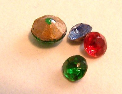 so I decided to pry a couple of them loose. I was amazed when I found out how easy the stones came out and even more stunned when I saw that they are mounted in wax! Each is "backed" with gold that seems to be flaking off. The piece is about 3 1/2" x 3 1/2" and has about 50 small stones imbedded. What is it? My curiosty really has the better of me.